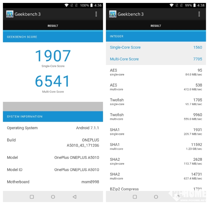 单核和多核性能要是我们经常关注的一项数值,我们使用Geekbench来测试这部分性能。经过小编实际测试,一加手机5T单核跑分为1907,多核跑分为6541,同样达到了业内高水平。