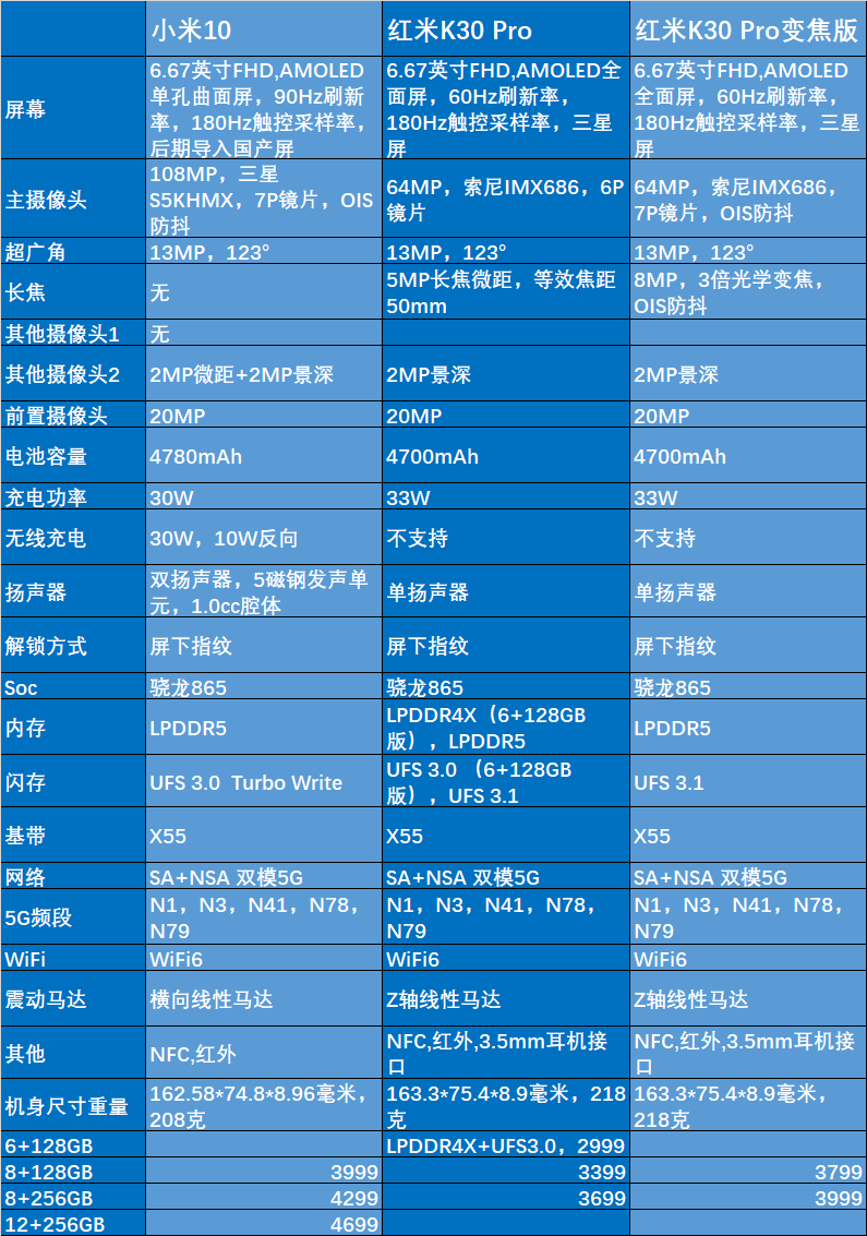 因此假如你确定好啦容积配备和费用预算得话,在挑选上不应该有多少难度系数,可是假如你沒有明确要什么容积,那么就遭遇8 258GB红米noteK30 Pro和8 128GB红米noteK30 Pro调焦版的较为,及其8 128GB小米10和8 258GB红米noteK30 Pro调焦版的较为。那麼大家下边就来简易的比照一下。