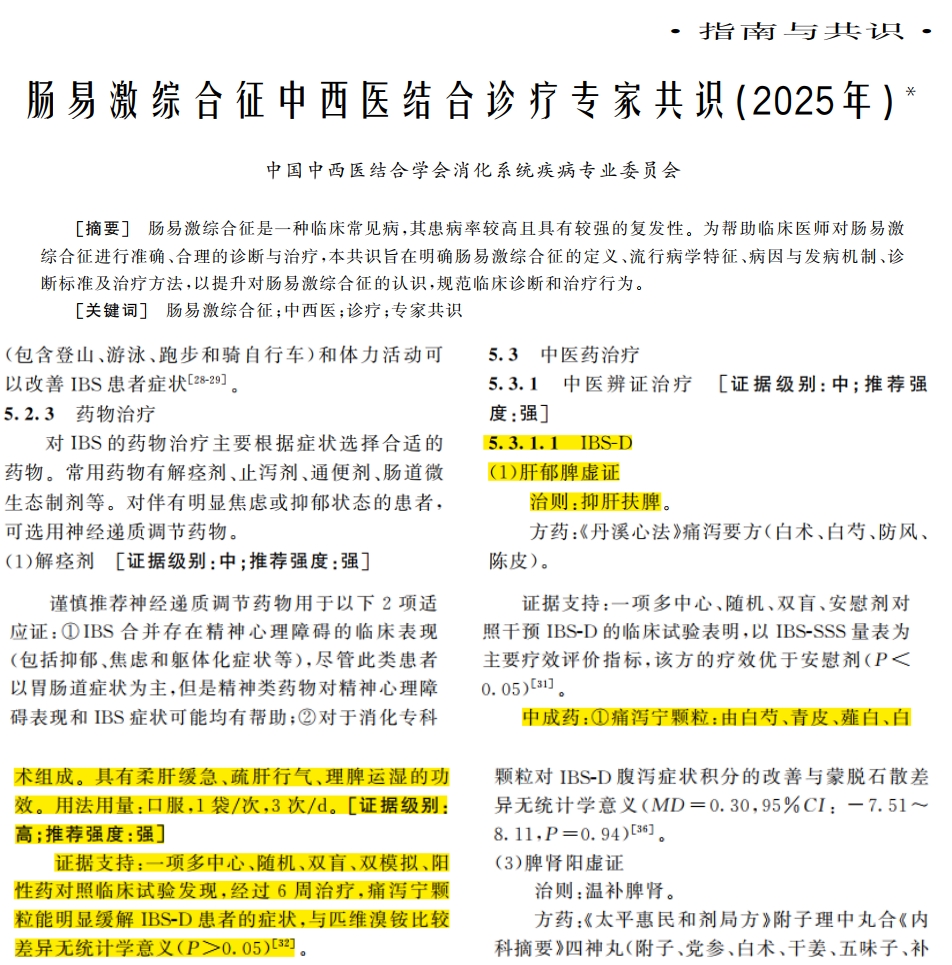 近日,中国中西医结合学会消化系统疾病专业委员会正式发布《肠易激综合征中西医结合诊疗专家共识(2025)》,其中再度推荐华森制药的痛泻宁颗粒用于临床治疗。值得一提的是,IBS-D肝郁脾虚证,治则应抑肝扶脾。痛泻宁颗粒作为唯一具有高级别循证医学证据、强推荐的中成药,其证据支持源于一项高质量大样本多中心RCT研究,结果显示经过6周治疗,痛泻宁颗粒能明显缓解IBS-D患者症状,与匹维溴铵(临床一线阳性化药)疗效相当。